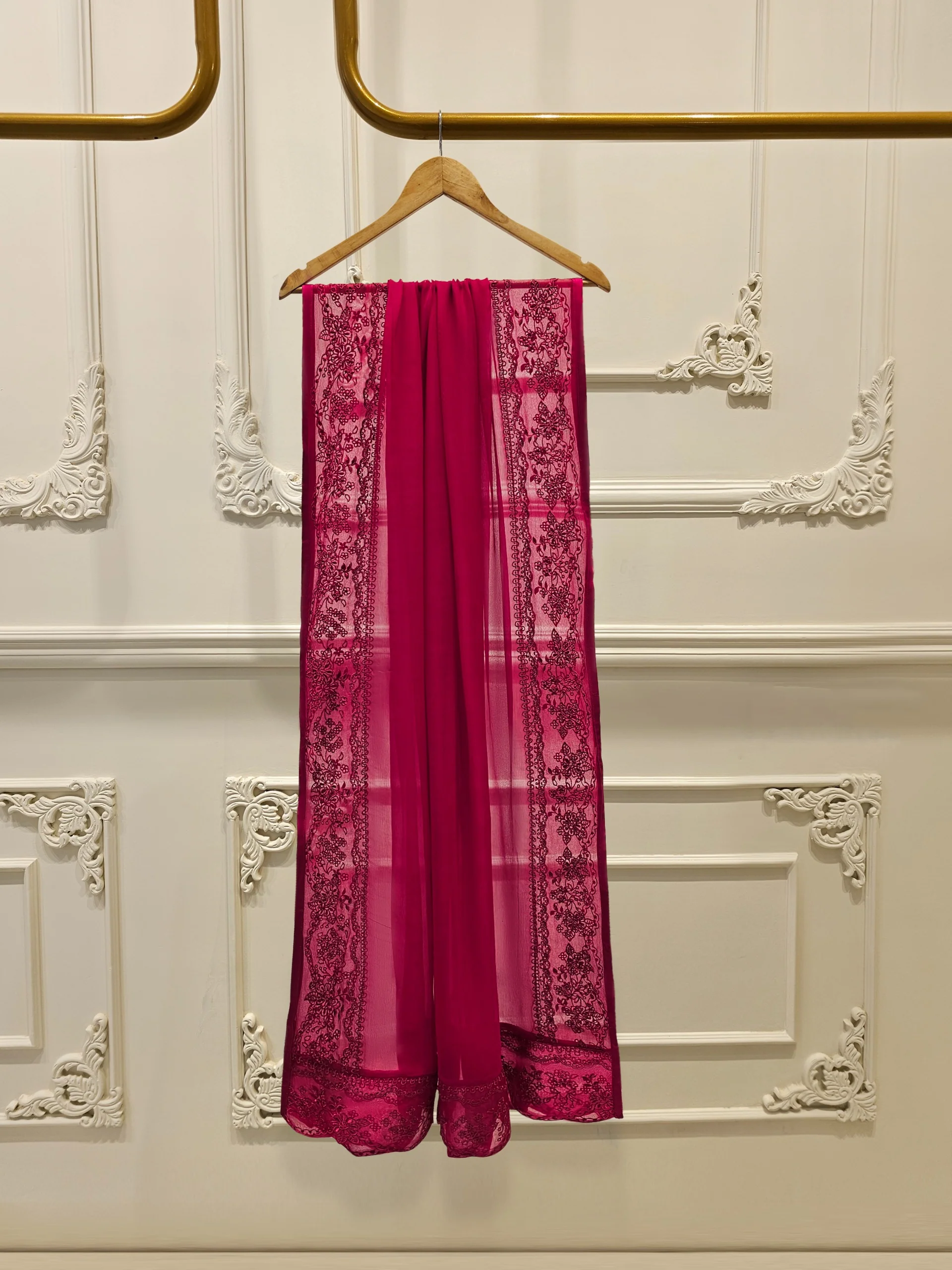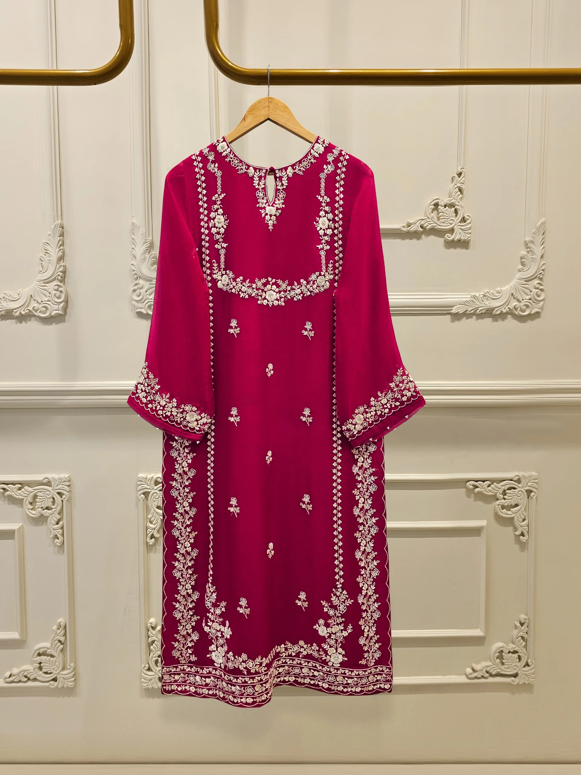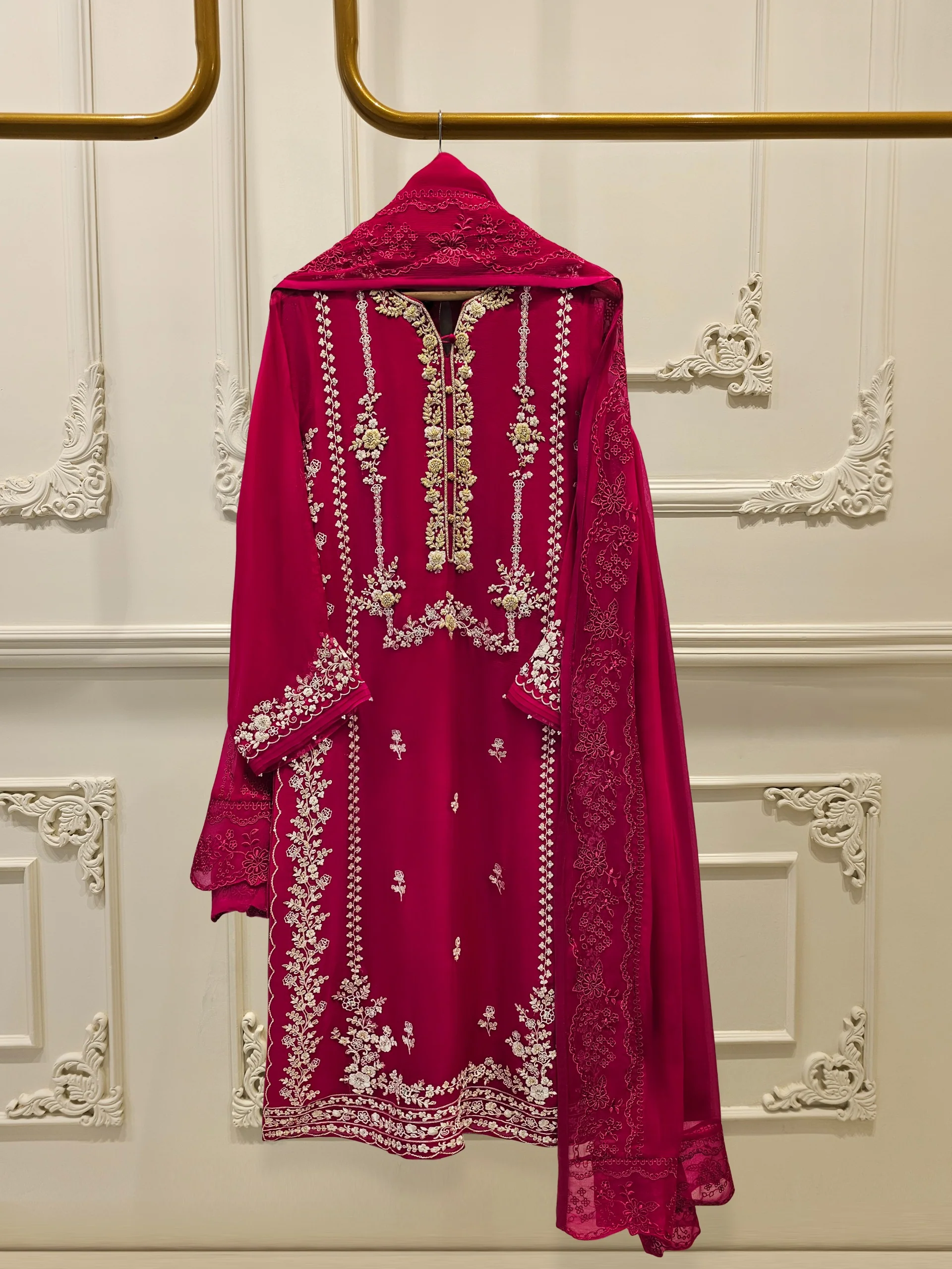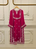 Elevate your style with Aghanoors hot pink embroidered chiffon straight shirt crafted with utmost care and attention to detail. The shirt features intricate embroidery on the front and sleeves, adding a touch of timeless charm. Paired with a matching pant & dupatta Length: 46″