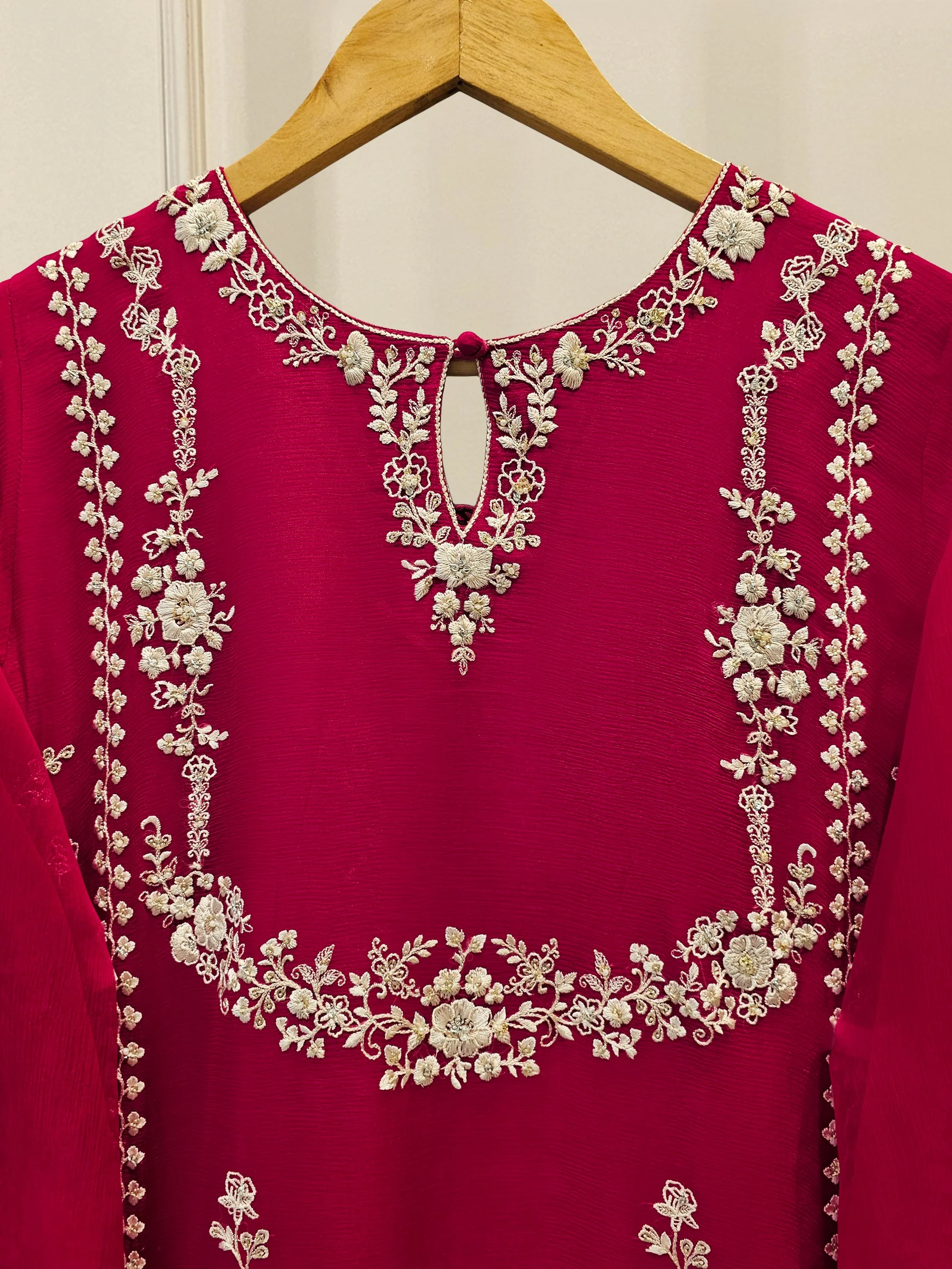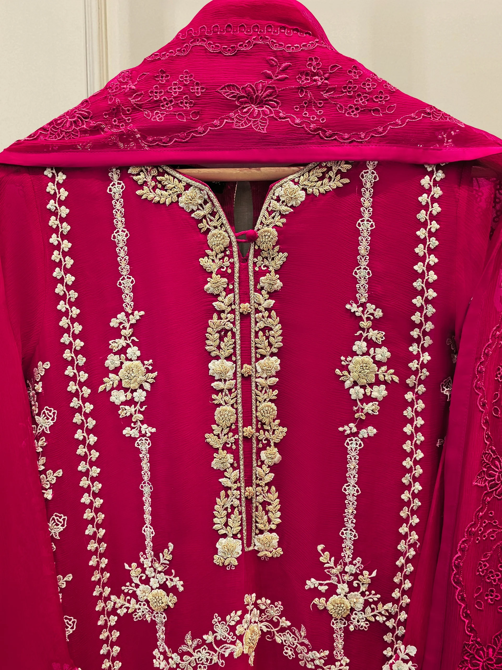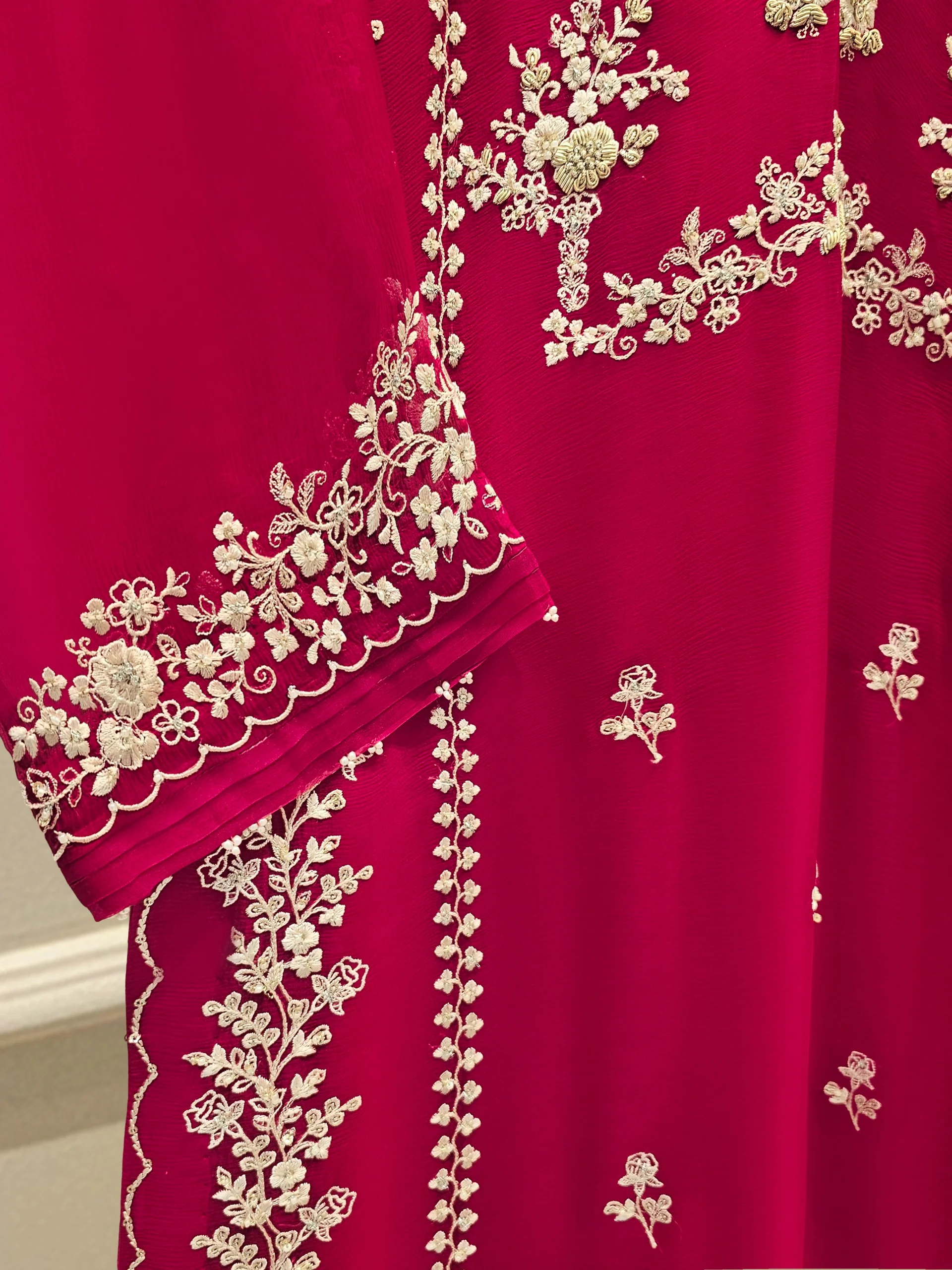 Elevate your style with Aghanoors hot pink embroidered chiffon straight shirt crafted with utmost care and attention to detail. The shirt features intricate embroidery on the front and sleeves, adding a touch of timeless charm. Paired with a matching pant & dupatta Length: 46″