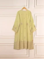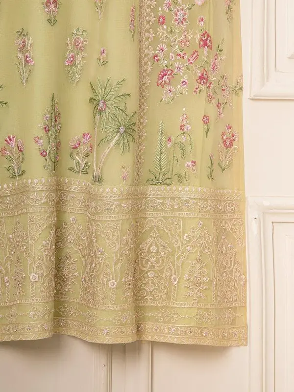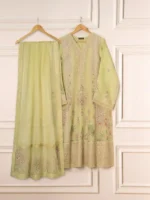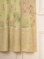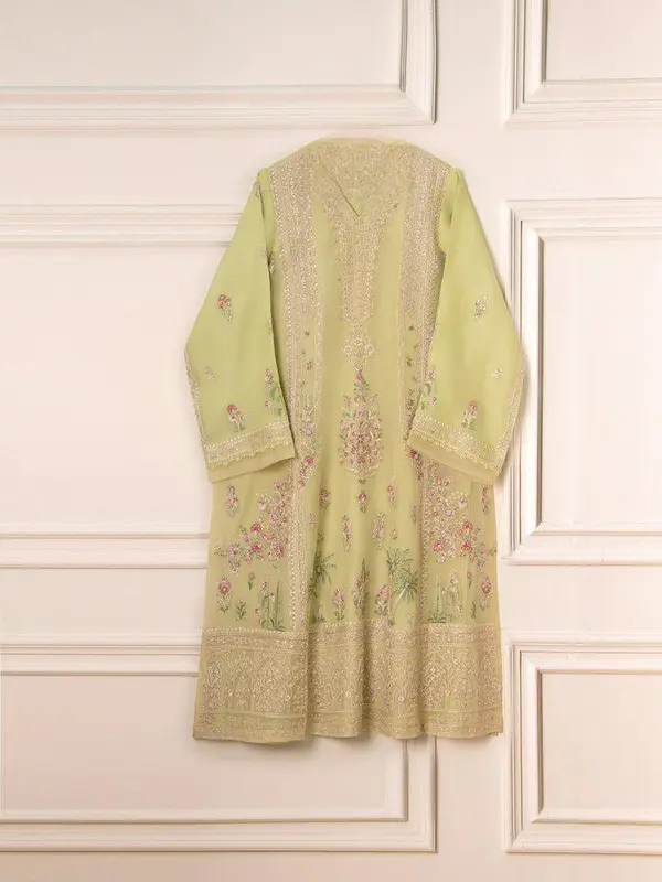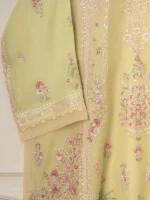 Elevate your style with Aghanoors pista green embroidered organza straight shirt crafted with utmost care and attention to detail. The shirt features intricate embroidery on the front and sleeves, adding a touch of timeless charm. Paired with a matching pant and dupatta Length: 42″