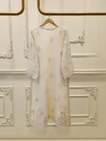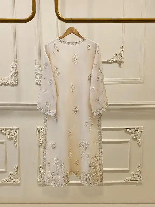 Elevate your style with Aghanoors off white embroidered organza straight shirt crafted with utmost care and attention to detail. The shirt features intricate embroidery on the front and sleeves, adding a touch of timeless charm. Paired with a matching pant and dupatta Length: 42″