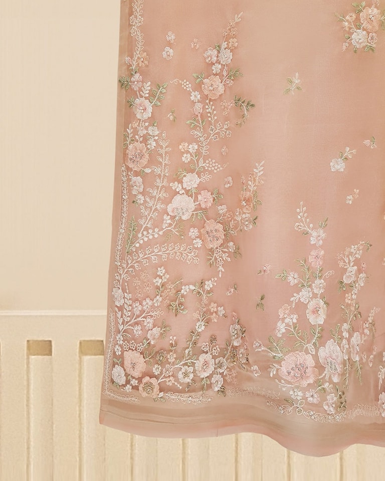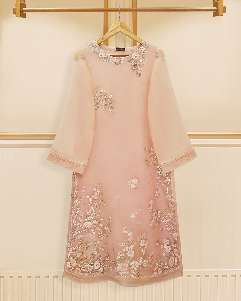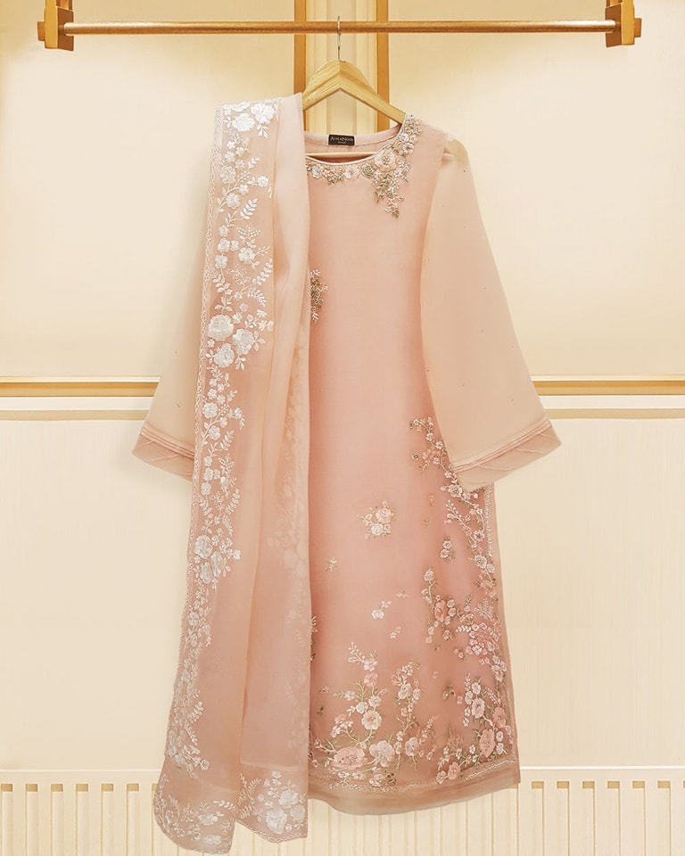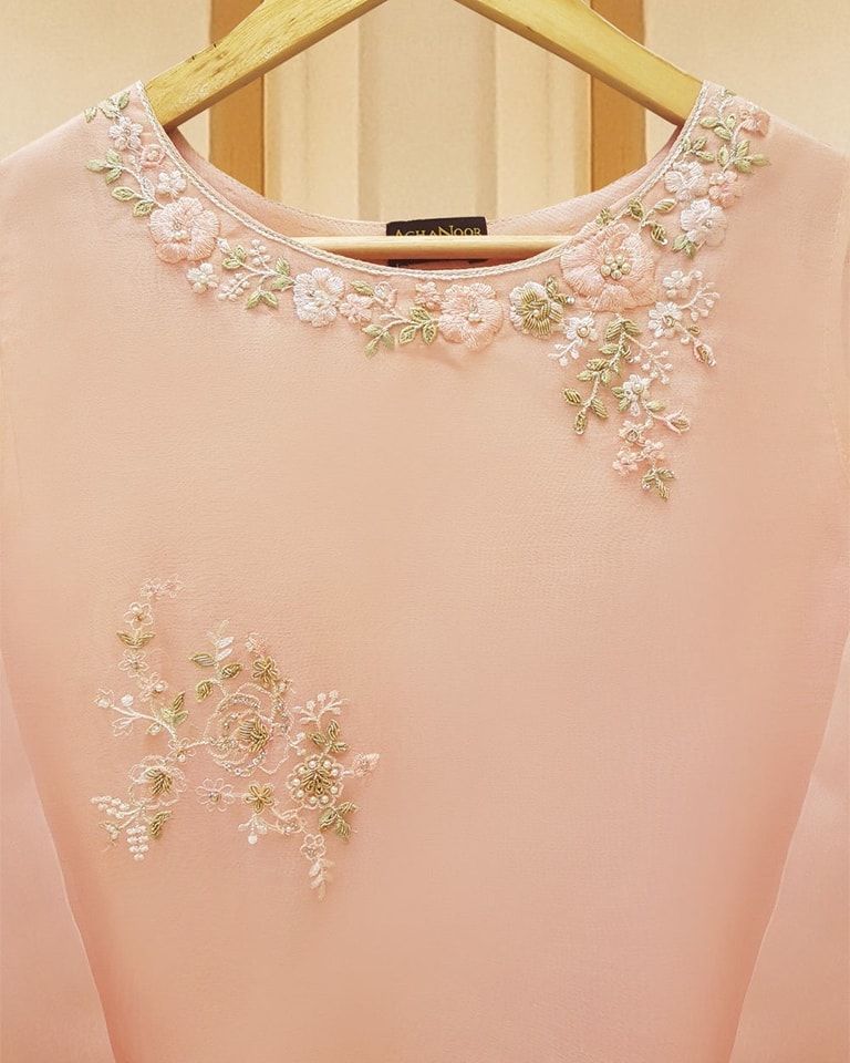 Elevate your style with AGHANOOR’s peach embroidered organza straight shirt crafted with utmost care and attention to detail. The shirt features intricate embroidery on the front and sleeves, adding a touch of timeless charm.