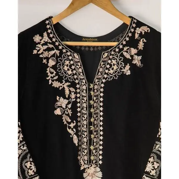 Step into the festive vibe with Aghanoor’s luxurious velvet outfit accented with intricate embroidery for a timeless statement.